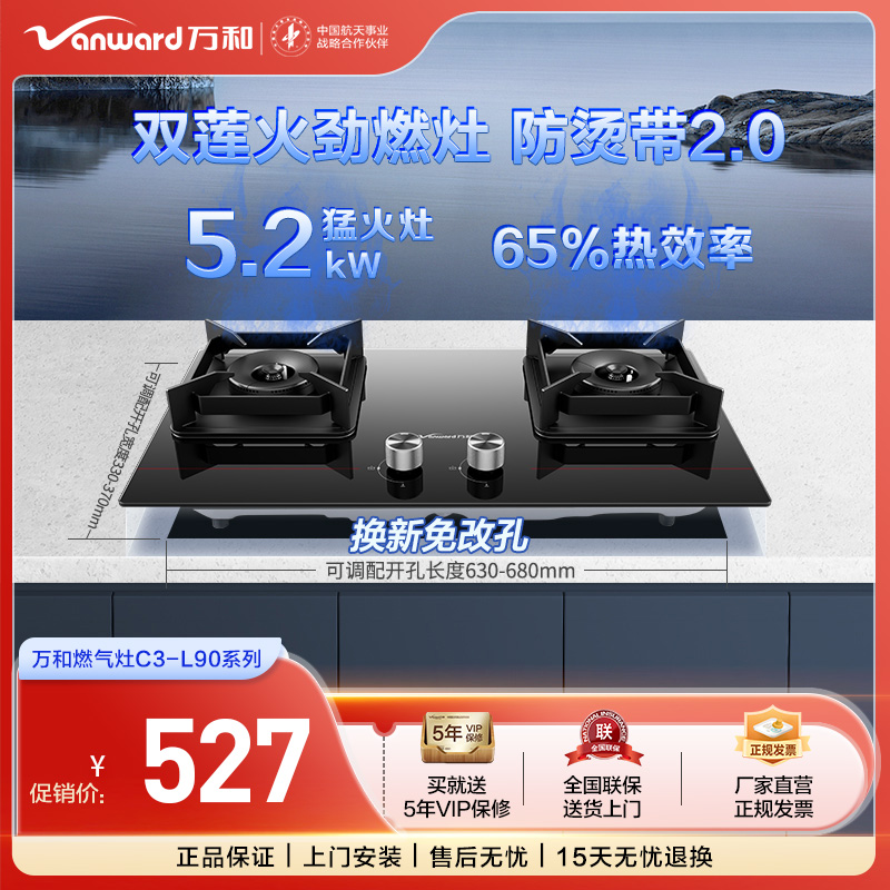 万和 蓝莲花5.2kW大火力65%高热效燃气灶家用双灶灶具C3-L90(天然气,液化气)