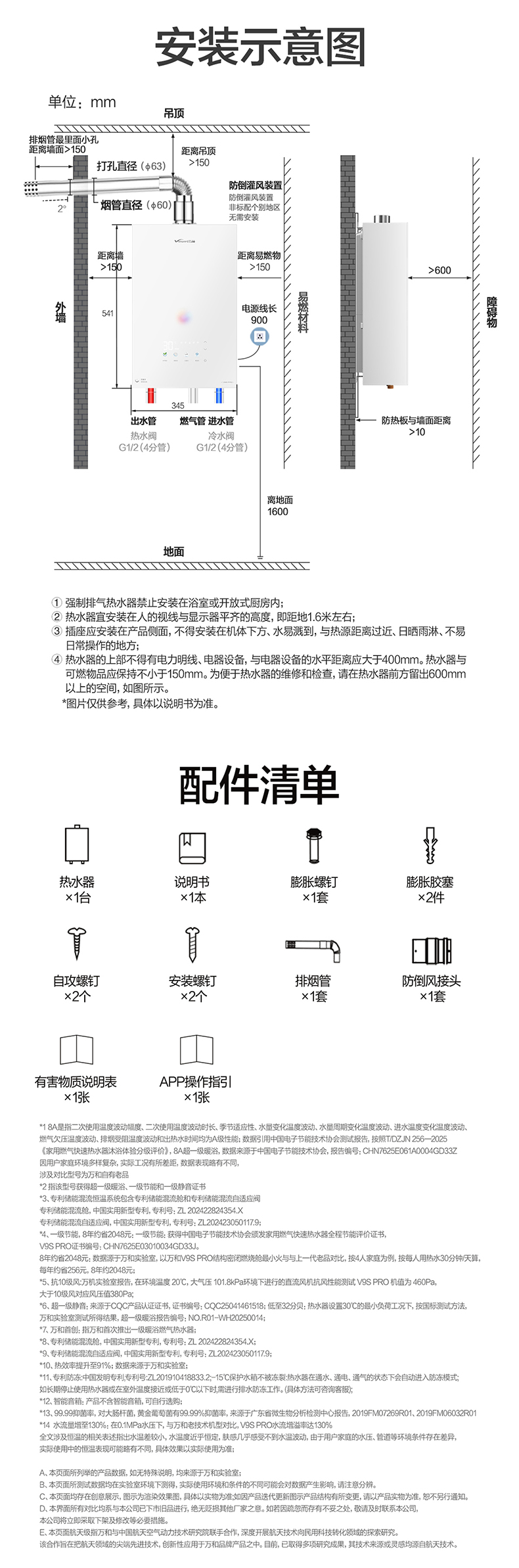 热水器*1,说明书*1,膨胀螺钉*1,膨胀胶塞*2,自攻螺钉*2,安装螺钉*2,排烟管*1,放倒风装置*1,有害物质说明表*1,APP操作指引*1