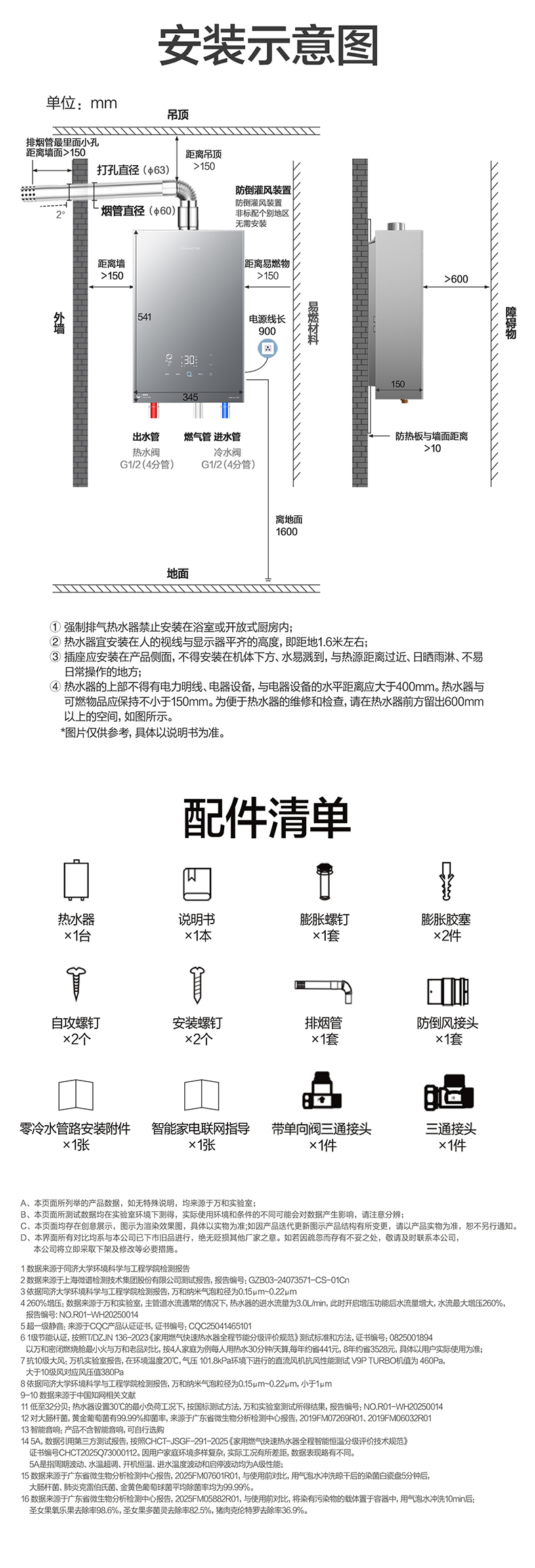 热水器*1,说明书*1,膨胀螺钉*1,膨胀胶塞*2,自攻螺钉*2,安装螺钉*2,排烟管*1,防倒风接头*1,零冷水管路安装附件*1,智能家电联网指导