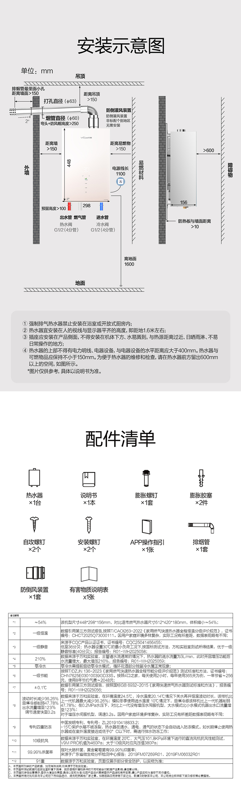 热水器*1,说明书*1,膨胀螺钉*1,膨胀胶塞*2,自攻螺钉*2,安装螺钉*2,APP操作指引*1,排烟管*1,防倒风装置*1,有害物质说明表*1