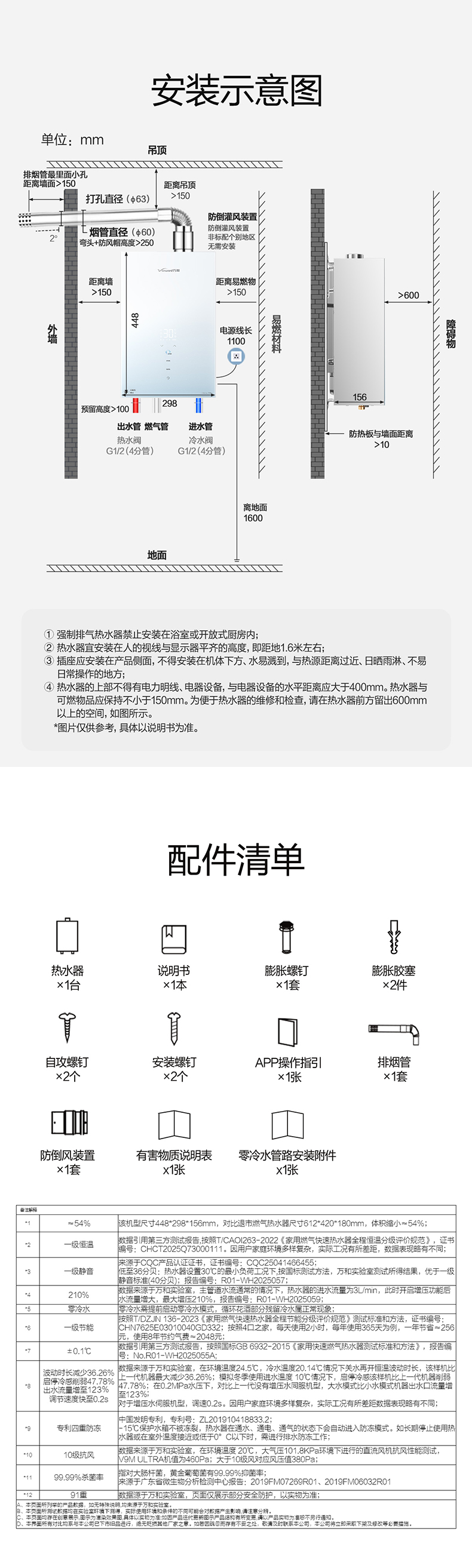 热水器*1,说明书*1,膨胀螺钉*1,膨胀胶塞*2,自攻螺钉*2,安装螺钉*2,APP指引操作,排烟管*1,防倒风装置*1,有害物质说明表*1,零冷水管路安装附件*1